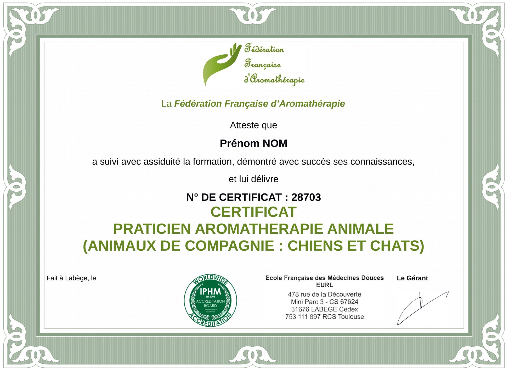- Certificat IPHM de "Praticien en Aromathérapie Animale pour animaux de compagnie : chiens et chats" téléchargeable (pdf) et envoyé par courrier postal.