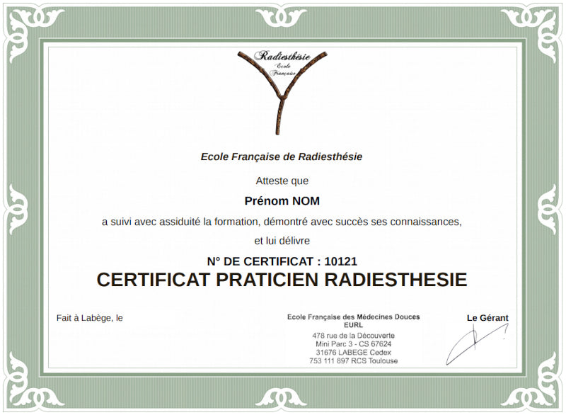 - "Certificat de Praticien en Radiesthésie" téléchargeable (pdf) et envoyé par courrier postal.