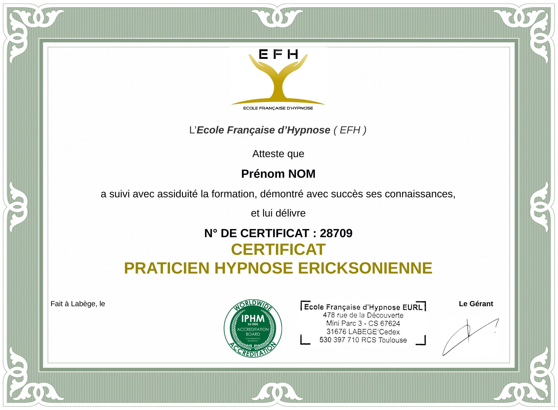 - Certificat IPHM de "Praticien en Hypnose Ericksonienne" téléchargeable (pdf) et envoyé par courrier postal.