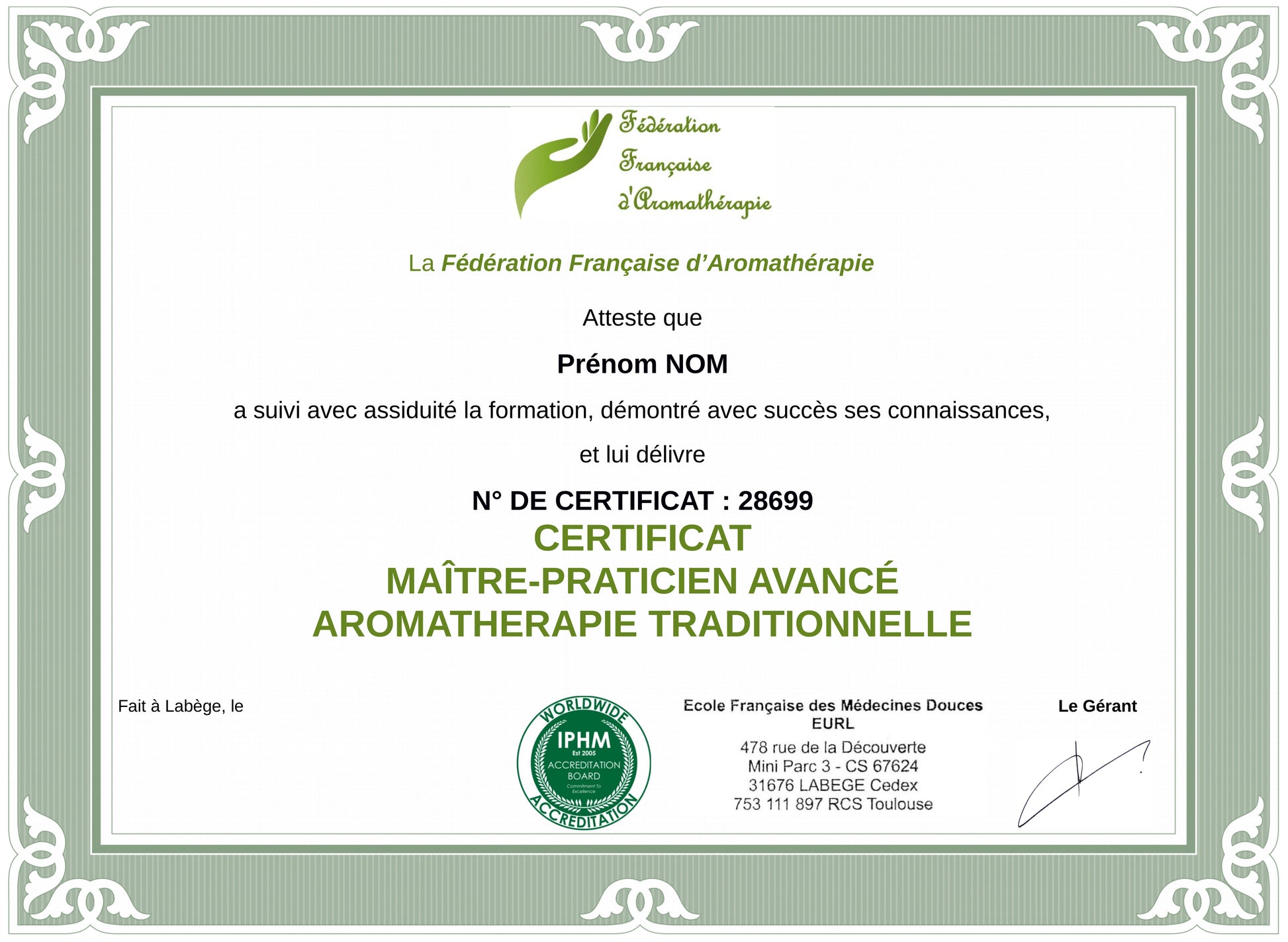 - Certificat IPHM de "Maître-Praticien Avancé en Aromathérapie Traditionnelle" téléchargeable (pdf) et envoyé par courrier postal.